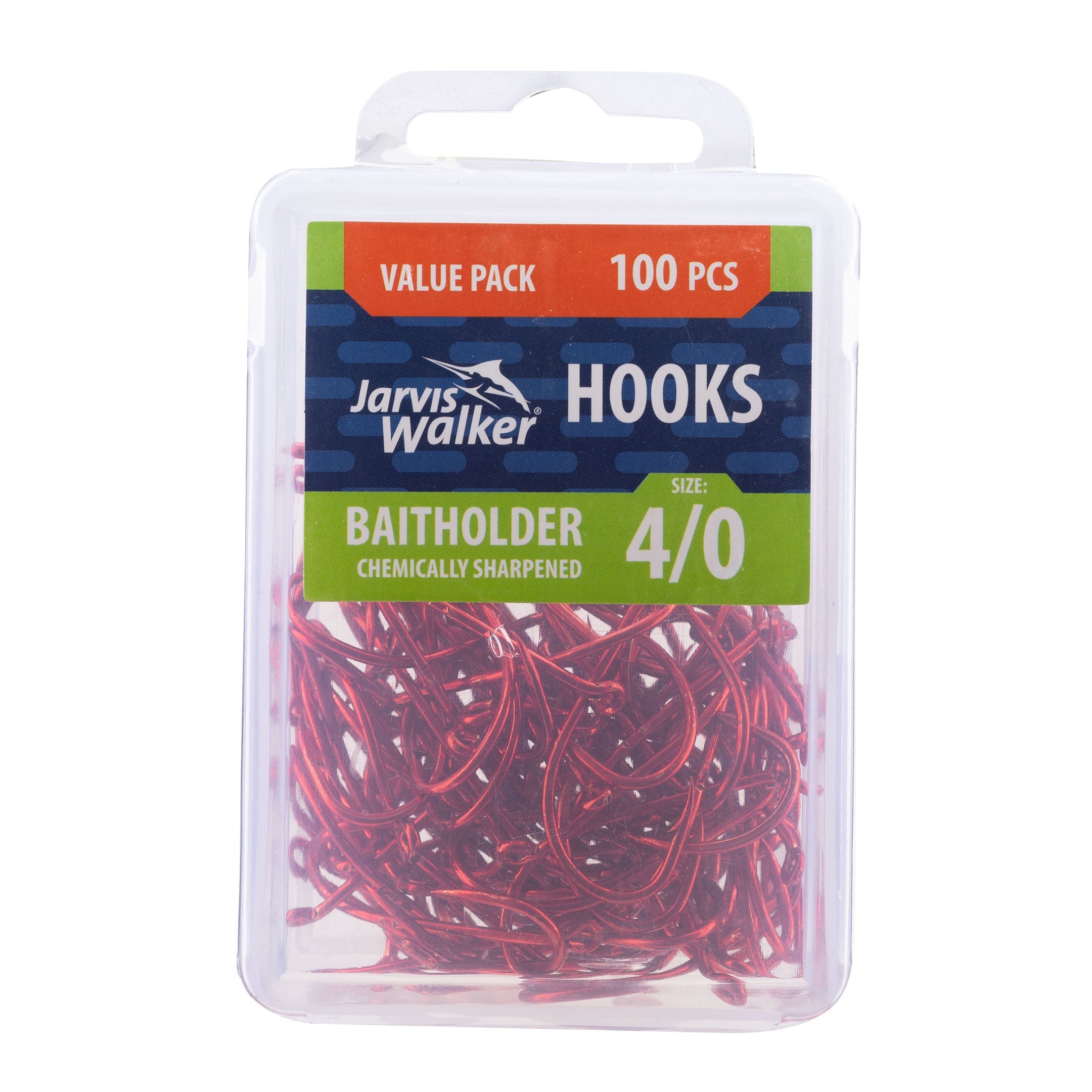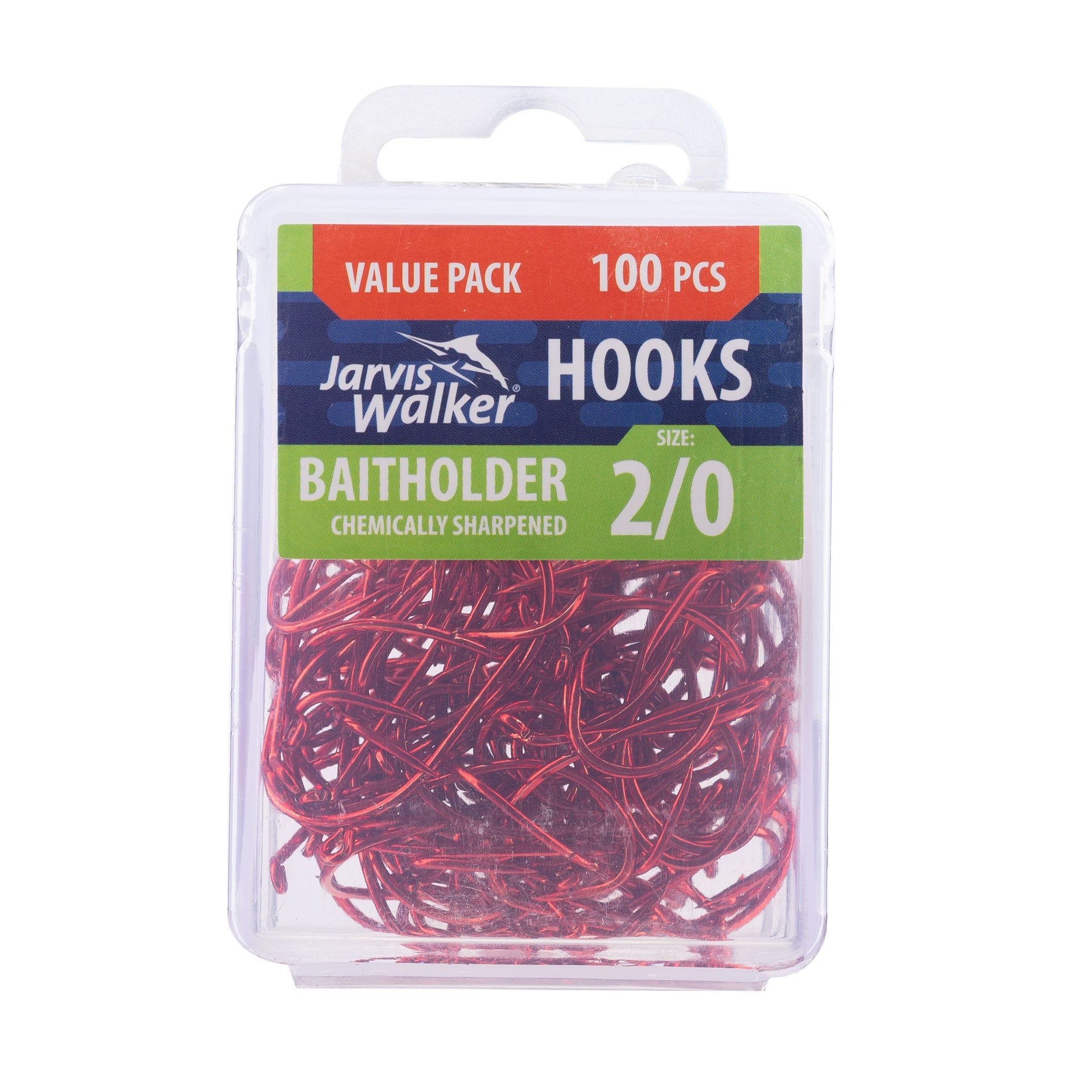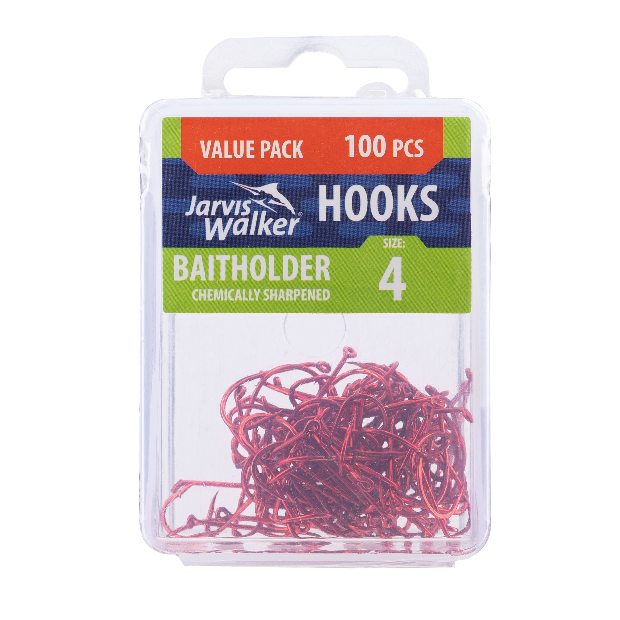 Jarvis Walker Baitholder Hooks have a specialist bait fishing hook pattern has two pronounced slices on the shank to hold your bait in place for perfect presentation. It has a turned-down eye, chemically sharpened point and is ideal for a variety of baits such as fish strips, prawns, worms and live or fresh nippers (yabbies).