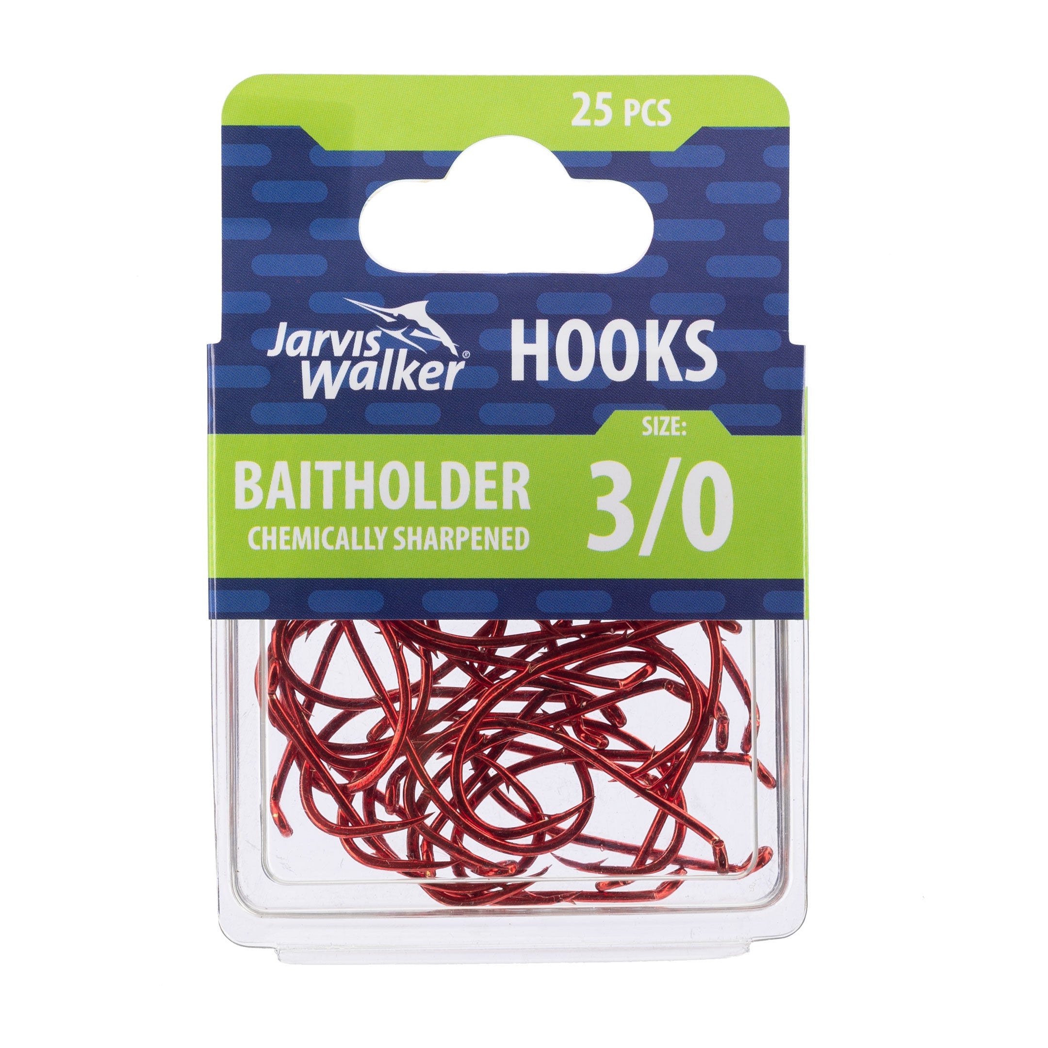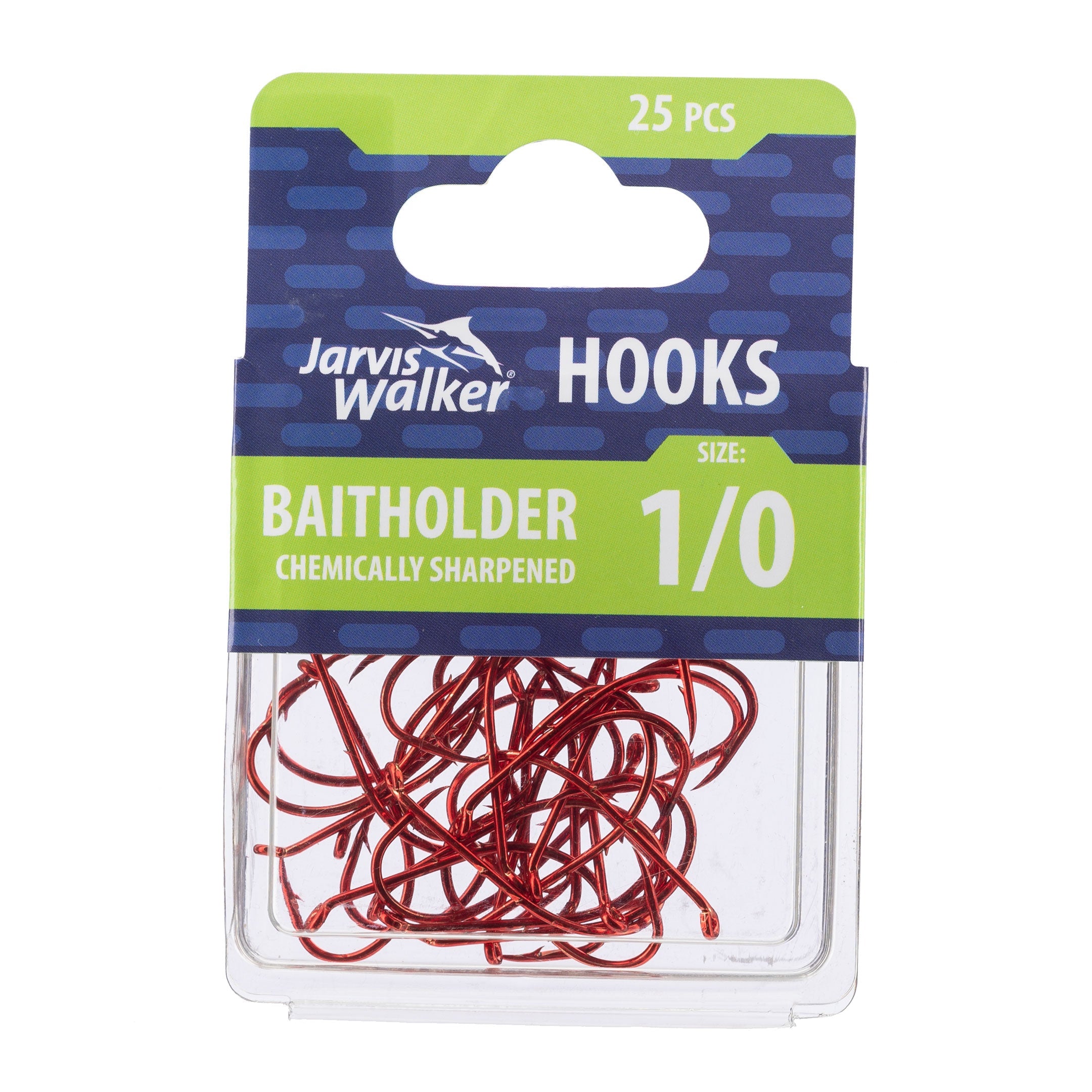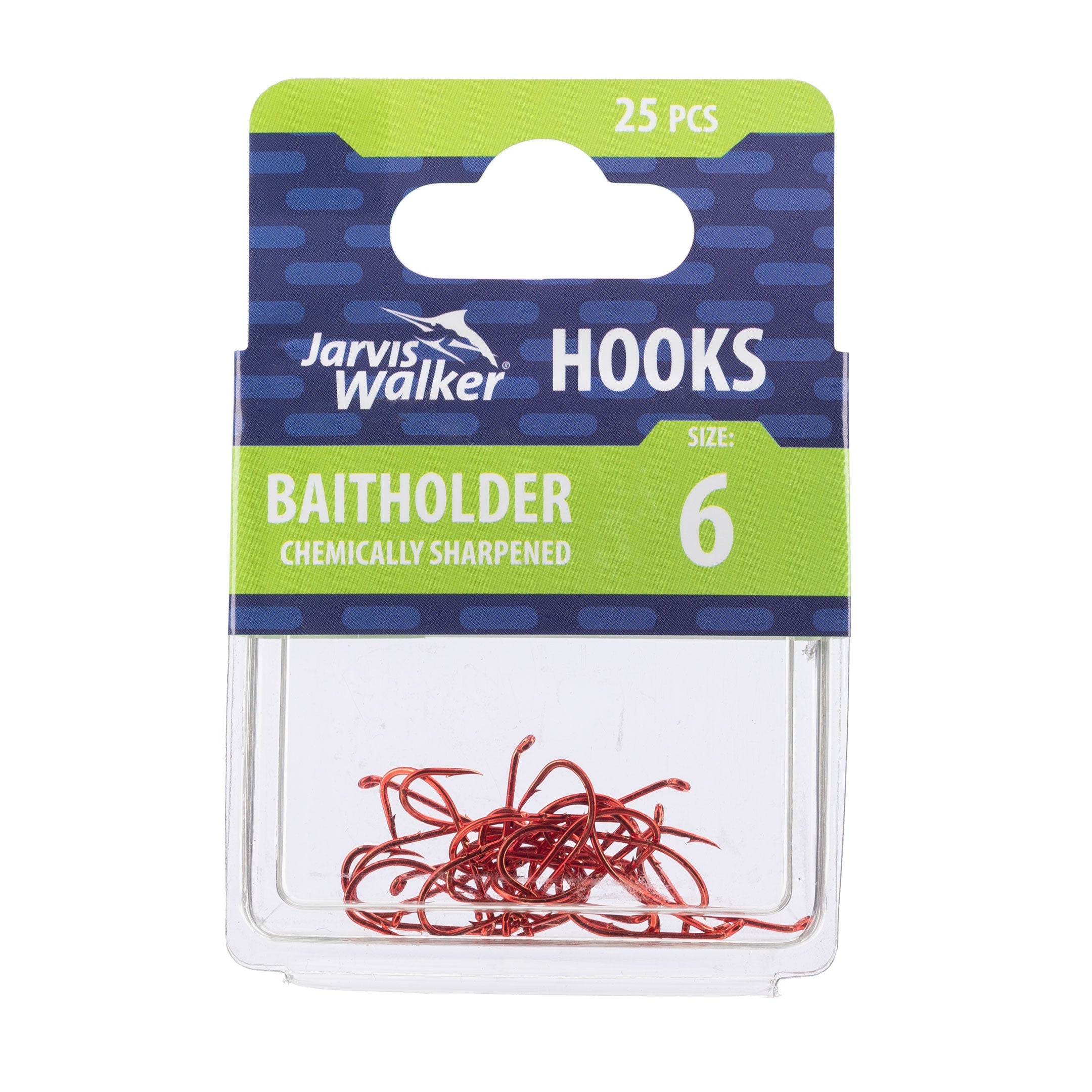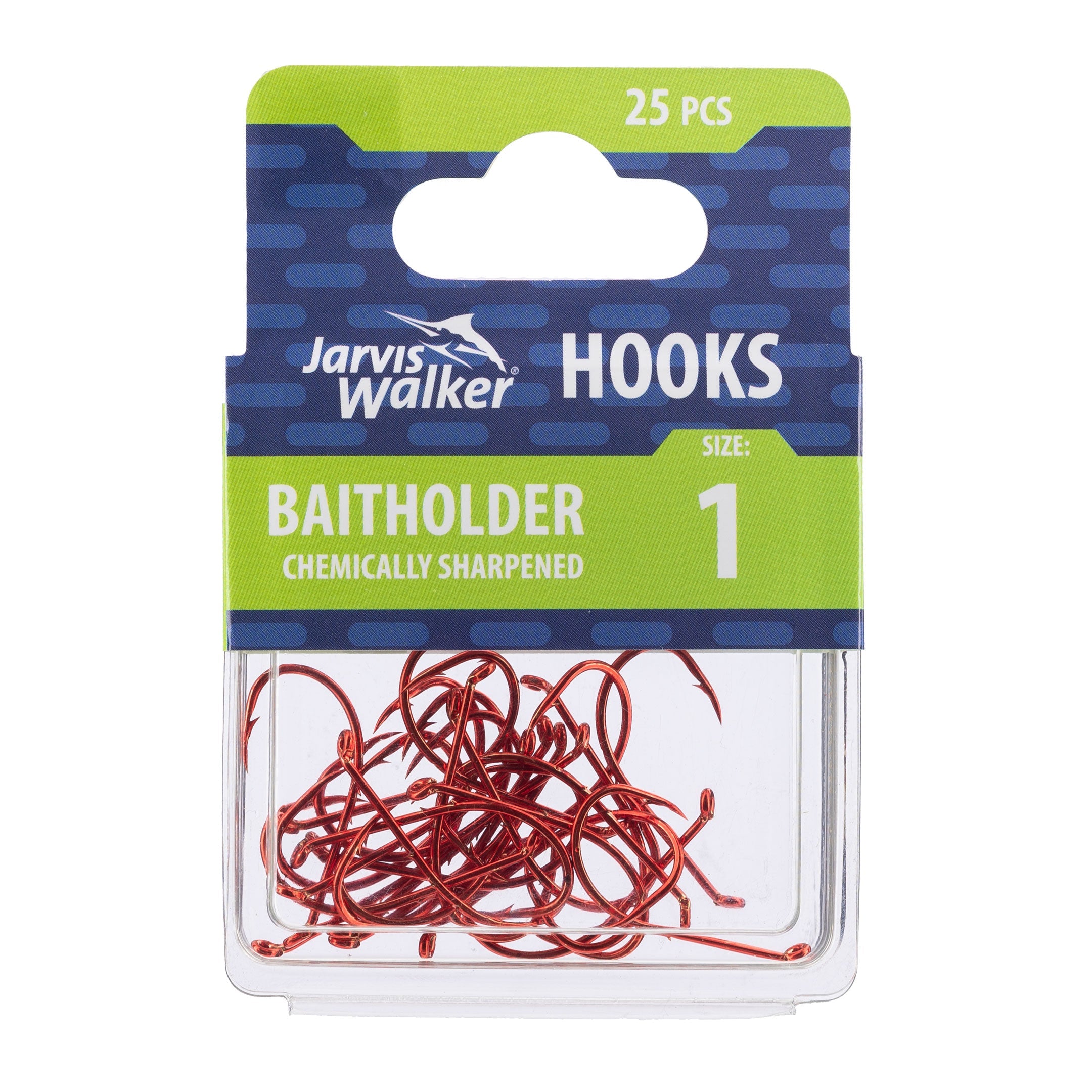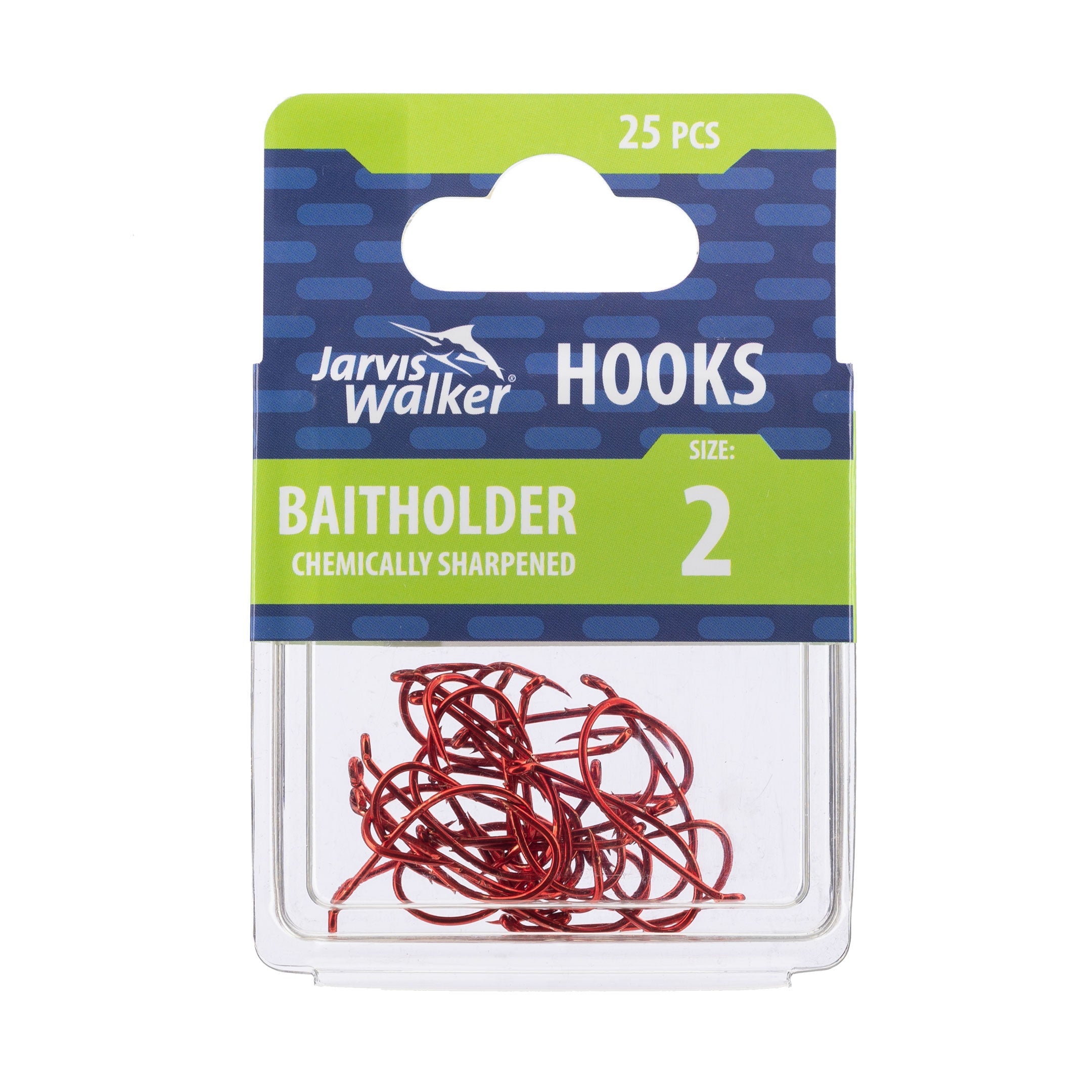 Jarvis Walker Baitholder Hooks have a specialist bait fishing hook pattern has two pronounced slices on the shank to hold your bait in place for perfect presentation. It has a turned-down eye, chemically sharpened point and is ideal for a variety of baits such as fish strips, prawns, worms and live or fresh nippers (yabbies).